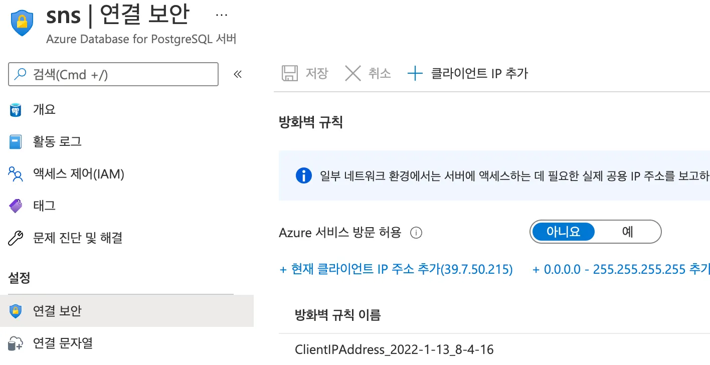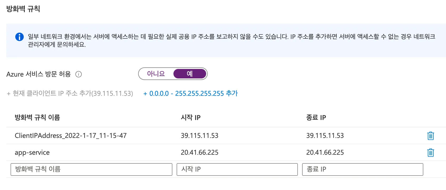 → Azure Database의 방화벽 정책에서 방화벽 규칙에 App Service의 IP 접근 허용