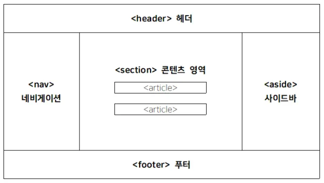 <section>: 일반적으로 큰 주제에 따른 구분하고, 특정 주제에 따라 여러 컨텐츠를 담는 태그