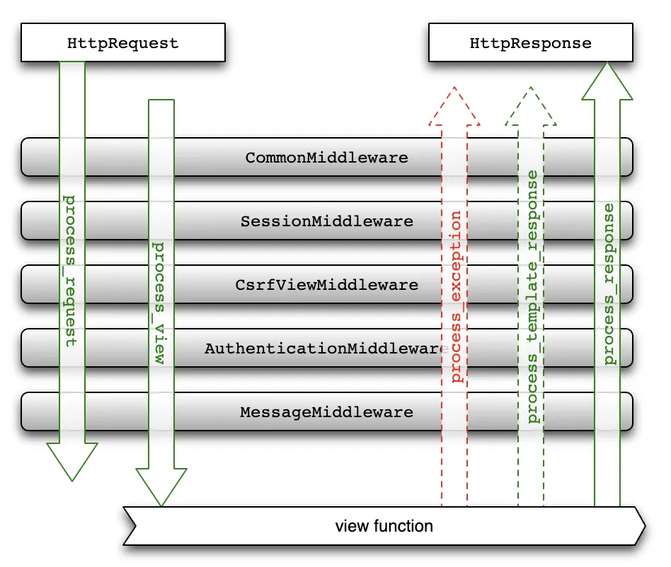 Middleware는 HttpRequest에 맵핑된 view function이 실행되기 전에 두 개의 hook이 호출됨