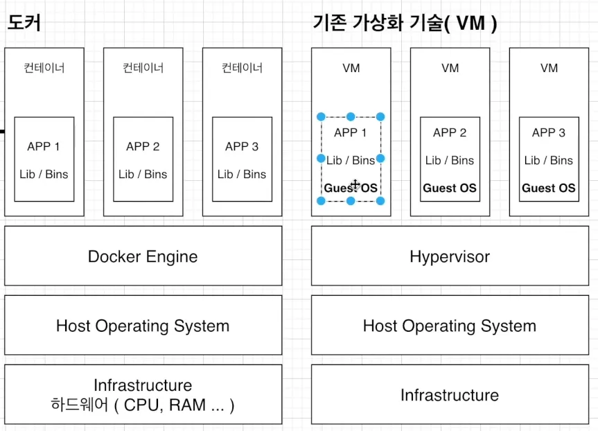 : 도커는 Guest OS 및 하이퍼바이저 불필요합니다. Host OS 위에 Docker Engine을 통해 도커 이미지를 배포하여 각 컨테이너 안에서 앱 실행
