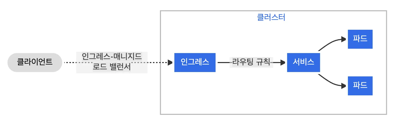 이하의 이미지는 인그레스에 의해 클러스터 내부의 트래픽을 서비스로 라우팅하는 것을 보여줍니다.
