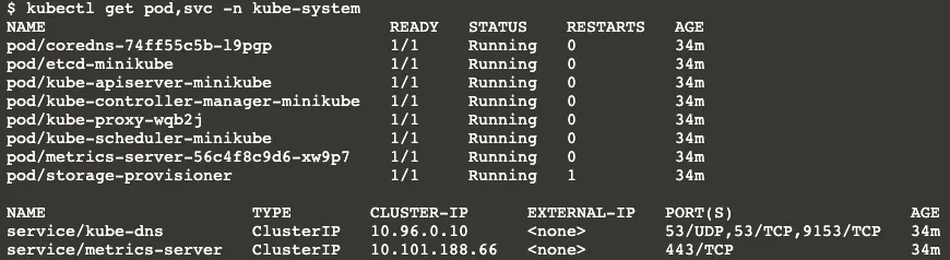 각각의 네임스페이스에서 관리하는 구성요소가 다릅니다. default 네임스페이스 이하에서 nginx 등의 파드가 관리되며, kube-system 네임스페이스 이하에서도 특정 파드가 관리됩니다. 예를 들어, 아래와 같은 명령으로 kube-system 네임스페이스에서 관리되는 파드를 확인할 수 있습니다.