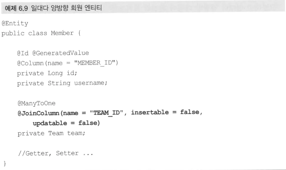 연관관계 비주인 객체에 @mappedBy 활용하여 주인 객체를 참조하도록 설정한다. 1:N 양방향 관계에서 연관관계 비주인(N에 해당)은 읽기만 가능하다. 관련 설정을 위해 N객체에 insertable, updatable을 모두 false로 설정해야 한다