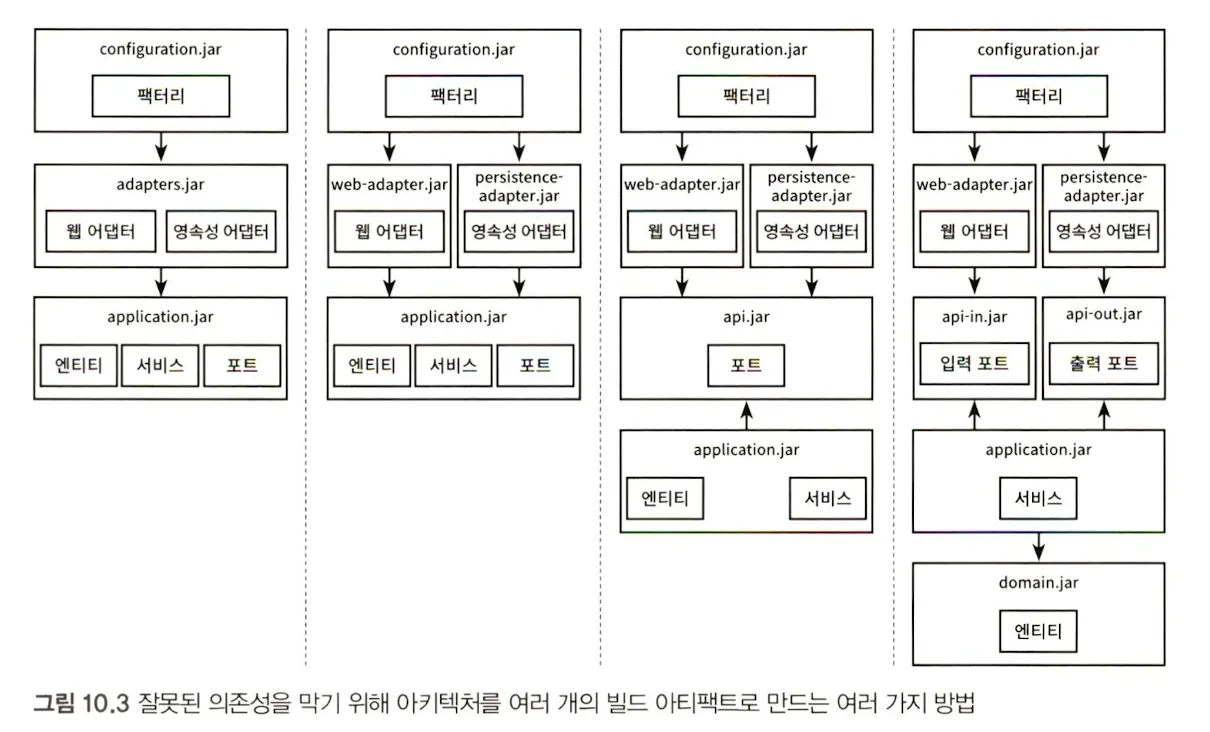 기능을 묶어서 새로운 패키지로 구성하되, 패키지 외부에서 접근을 제어하기 위해 package-private 접근 수준을 적극 활용해야 합니다. 예를 들어, application, domain 패키지 내 어탭터로 접근해야 하는 클래스는 public으로 설정해도 됩니다. 하지만 adapter 패키지 내의 클래스의 경우 package-private으로 접근수준을 정의해야 합니다.