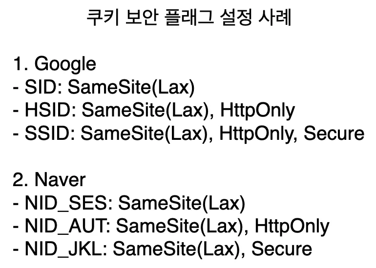 SameSite=None: Cross Site 요청에 first-party cookie와 third-party cookie 전송. None으로 설정된 경우 Secure flag가 반드시 설정되어야 함