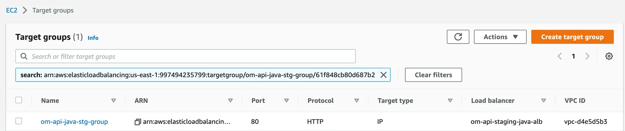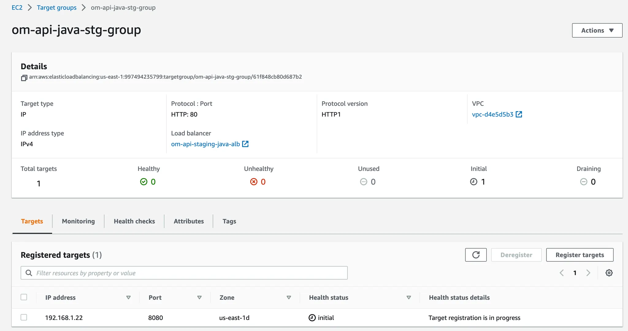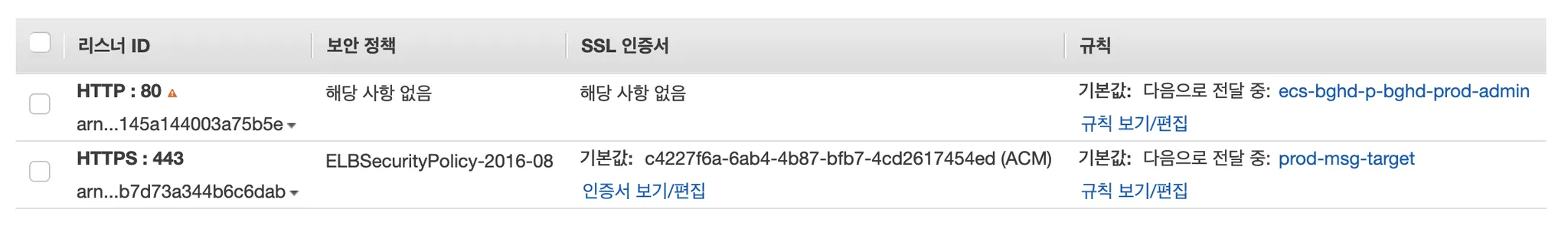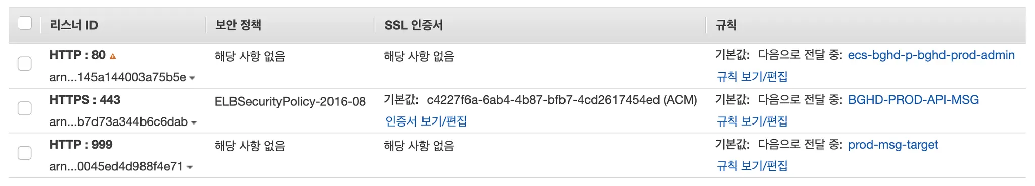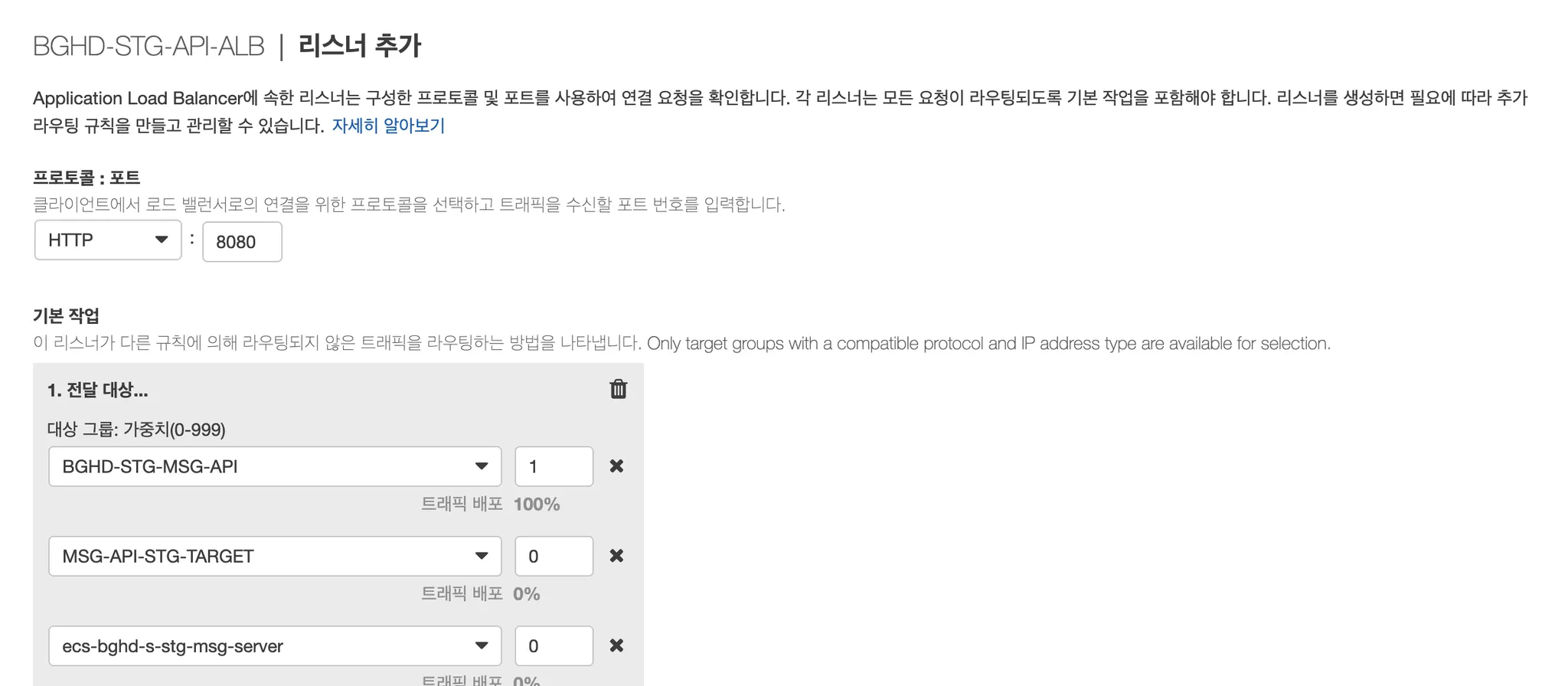 6) 새롭게 생성한 서비스가 운영환경에서 정상 동작하는 지 임시 포트로 확인 후, 기존 트래픽에서 서비스하기 위해 로드밸런서 내 기존 포트에서 타겟그룹만 교체