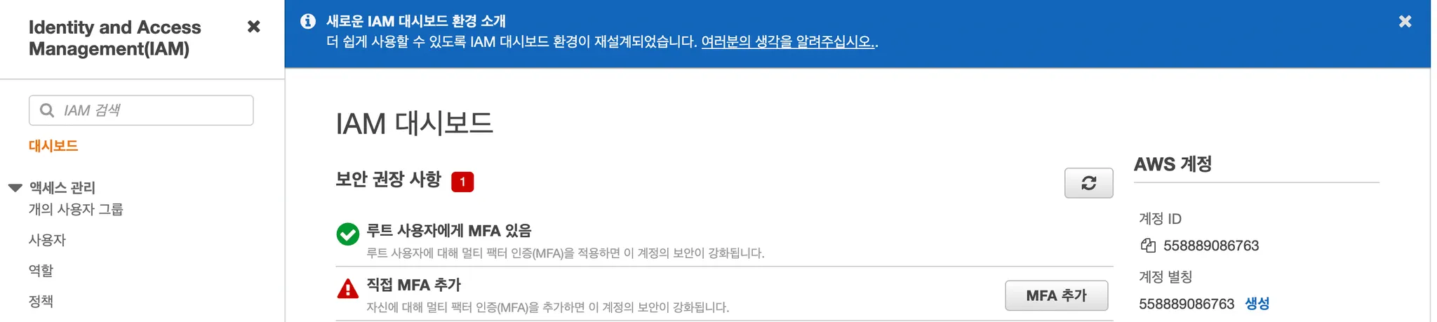 root account는 MFA 활용하여 2중화 방식으로 로그인하도록 설정하는 것이 안전