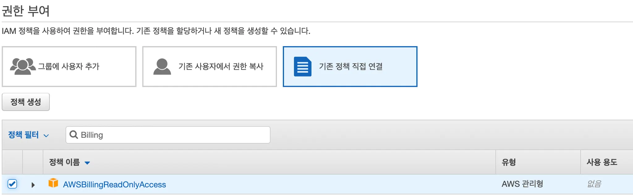 → BillingFullAccess를 어드민에 추가하면 서비스 이용 요금 상태를 확인할 수 있음