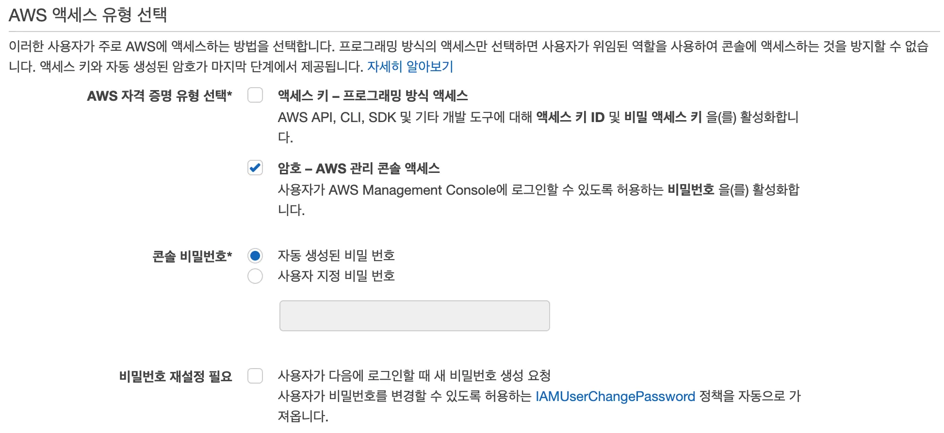 → AWS 자격 증명 유형 선택: AWS 관리 콘솔 액세스