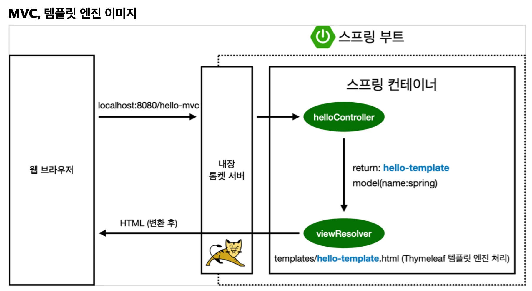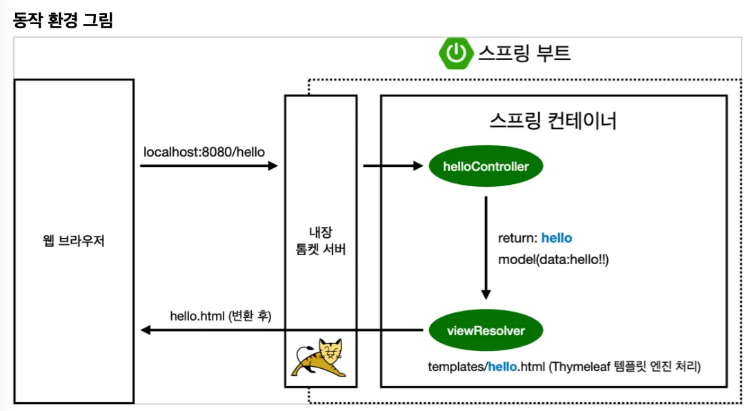 viewResolver는 웹 브라우저 요청에 대한 응답으로 helloController의 반환값으로 관련 템플릿을 찾아서 전달함(resources:templates/hello.html)