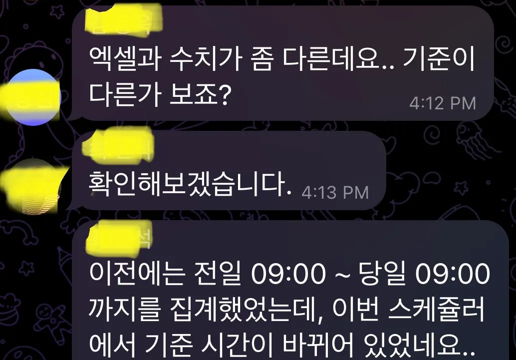 수동으로 집계한 데이터와 메신저로 전달한 데이터가 일치하지 않다는 클레임을 받았습니다.